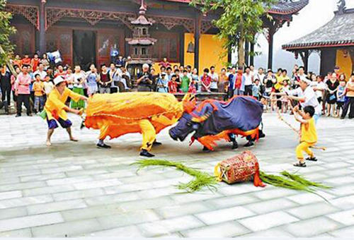 牛灯舞盛行于越溪。一人扮牧童,二人顶戴牛型道具扮牛。牧童在锣鼓声中先面向观众说顺口溜,表示节日祝贺,然后牵牛出场舞蹈。主要是摹拟日常喂牛、用牛、与牛嬉戏等舞姿。最受欢迎的是,“牛”发“吼”,不听使唤,狂奔乱跳,急得牧童抓脑搔腮、窘态万状。逗得观众大乐。由于牛可耕田、驮运,与民众生产、生活关系密切,故此舞蹈使人感到亲切可爱。